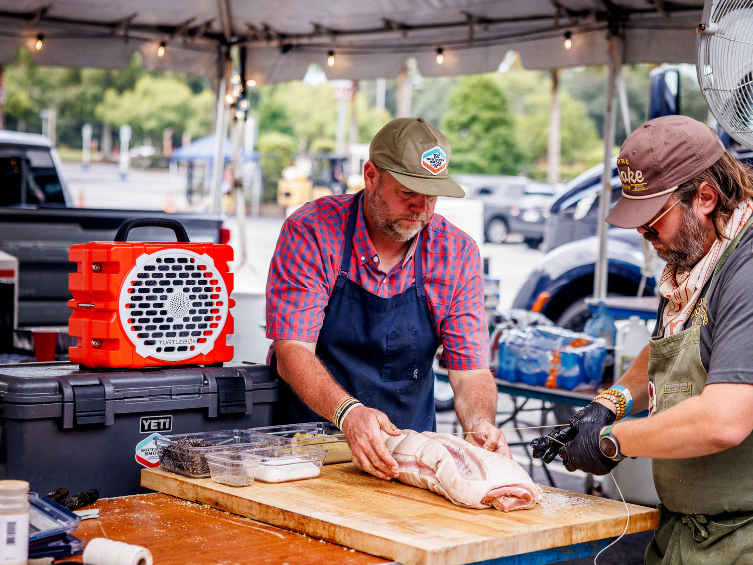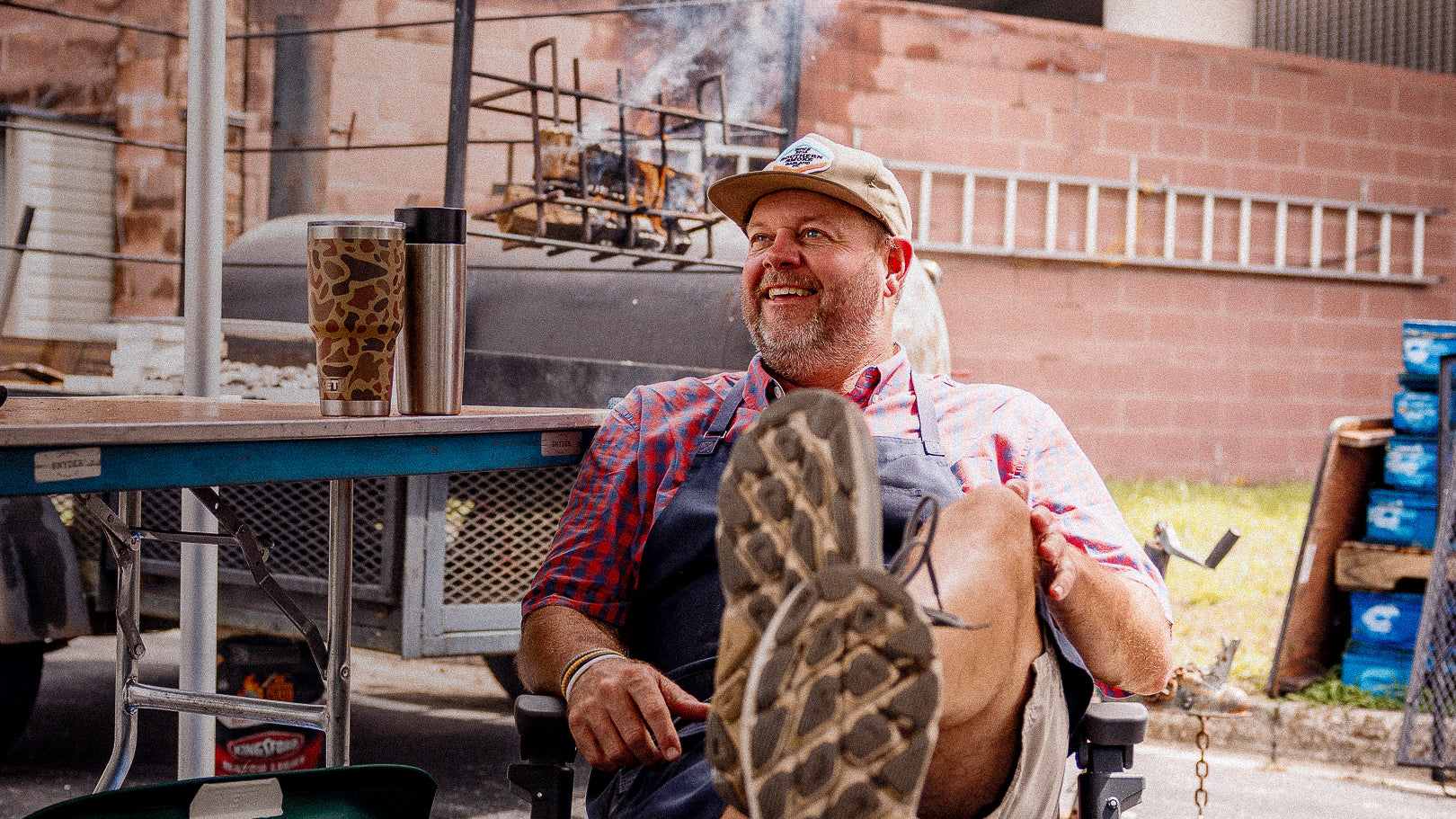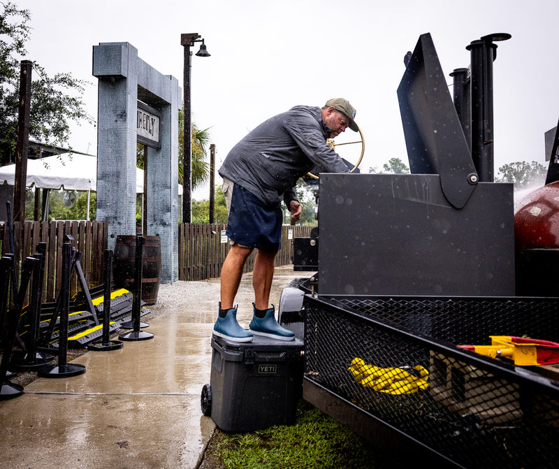 It starts early. There is nothing like getting fires started before sunrise, coffee in hand, smelling oak wood burning. The pits sit beside the building, so friends stop by all morning. Some are catching up. Some are checking the board.