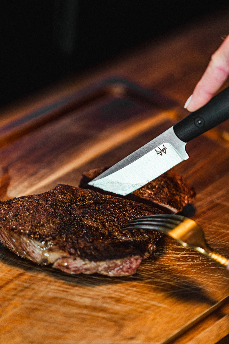 The Williams Steak Knife doesn't mess around. This knife is crafted for those who take their meals as seriously as their time outdoors. With a razor-sharp Elmax steel blade, this knife is built to glide through any cut of steak with precision and ease —whether you're slicing Ribeye, Filet, or your favorite Tomahawk.